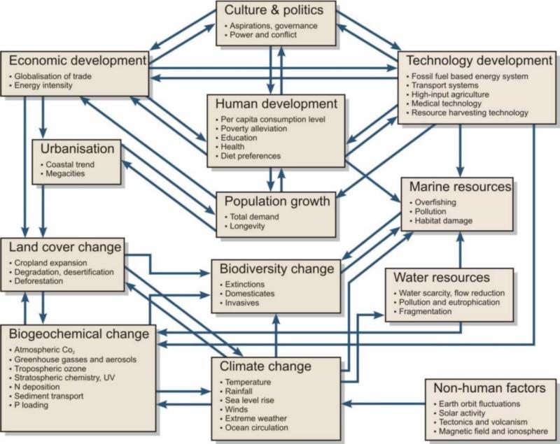 The core processes that underlie the changes in the global environment have been clearly identified (see diagram below) and have been unequivocally linked to human activity. There remains much uncertainty about their coupled dynamics over the next century and beyond, specifically relating to the strengths of various feedback loops that may serve either to slow the rate and extent of change, or accelerate and amplify it. It is understood at a theoretical level that a complex system of non-linear interacting factors incorporating time-lags and spatial heterogeneity is unlikely to change in a smooth and predictable fashion when nudged in a particular direction.